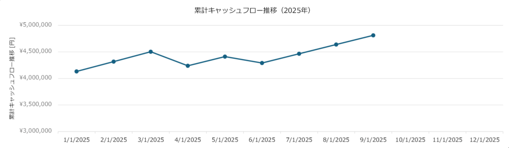 一般的に、インカムゲインとは家賃収入から運用中の諸経費および税金を差し引いた金額を指します。しかし、私の場合は銀行からの借入による元利返済が毎月発生しているため、インカムゲインからその返済分を除いた、最終的な手残りであるキャッシュフローの総計をベースとしています。さらに、そこから購入時にかかった諸経費を差し引いた金額を、本記事における「インカムゲイン」として定義しています。