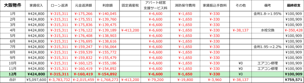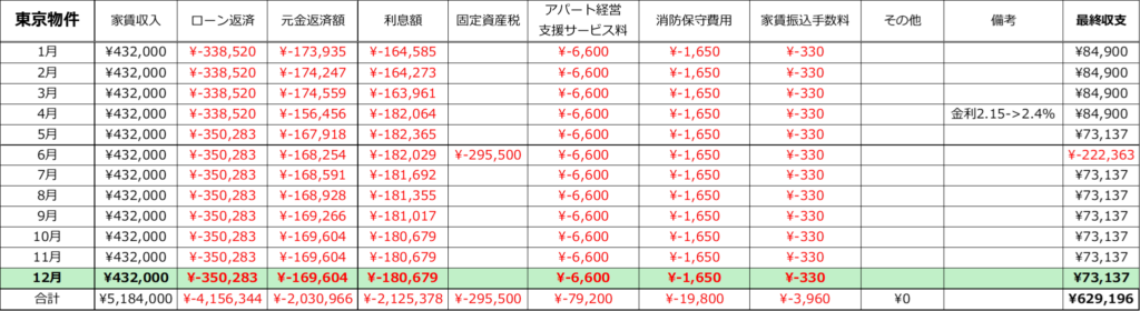 今年は日銀の利上げにより東京/大阪物件ともに+0.40%ローン金利が増加。大阪物件は5年猶予があるためキャッシュフローは影響してませんが、東京物件の毎月のキャッシュフローが1.9万円減となり中々の痛手です。